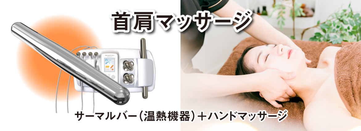 長時間保温構造で筋肉の緊張を和らげる温熱機器「サーマルバー」とハンドマッサージで首と肩をほぐします。